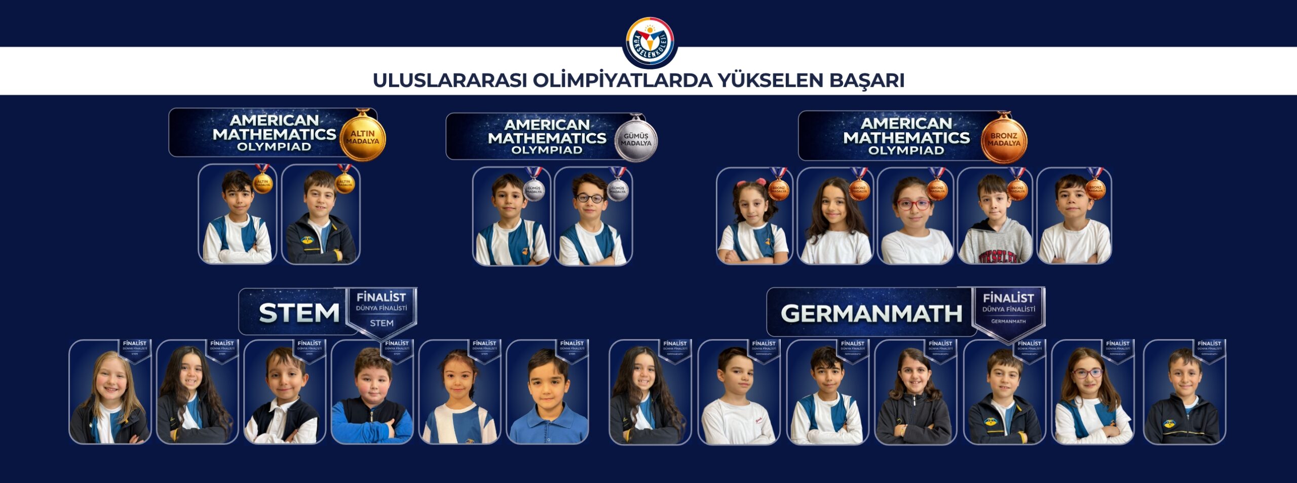 Yükselen Koleji öğrencileri, bu yıl American Mathematics Olympiad, STEM ve GermanMath yarışmalarında gösterdikleri üstün performansla uluslararası arenada büyük bir başarıya imza attı. Öğrencilerimiz; altın, gümüş ve bronz madalyaların yanı sıra özel başarı ödülleri ve dünya finalistliği dereceleri kazanarak hepimizi gururlandırdı.
